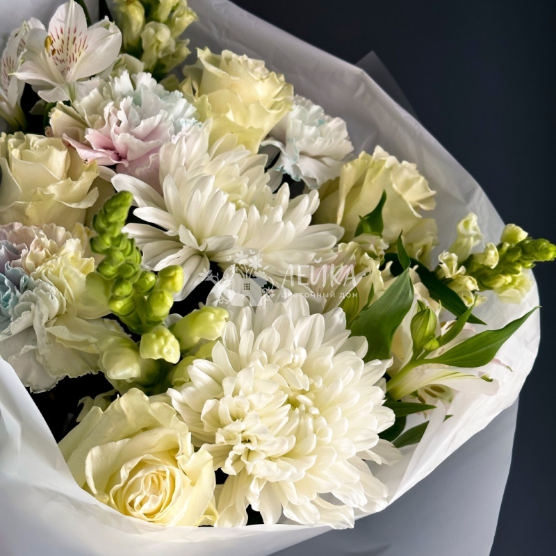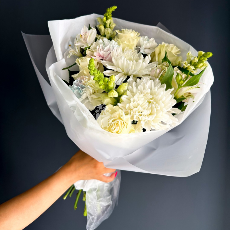 Весенний букет с сочной зеленью в прекрасной упаковке.