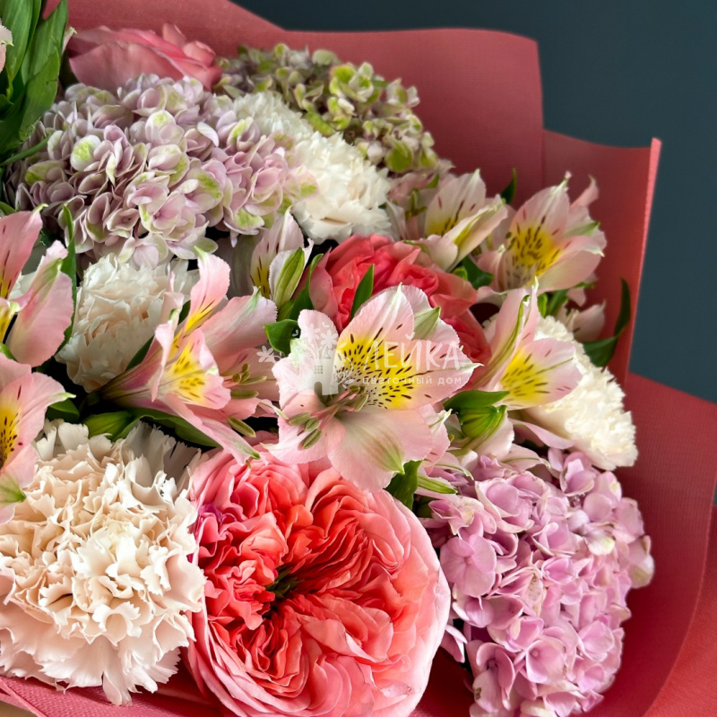Нежная гортензия в упаковке. Получатель, без сомнения, сохранит приятные эмоции, связанные с этим букетом