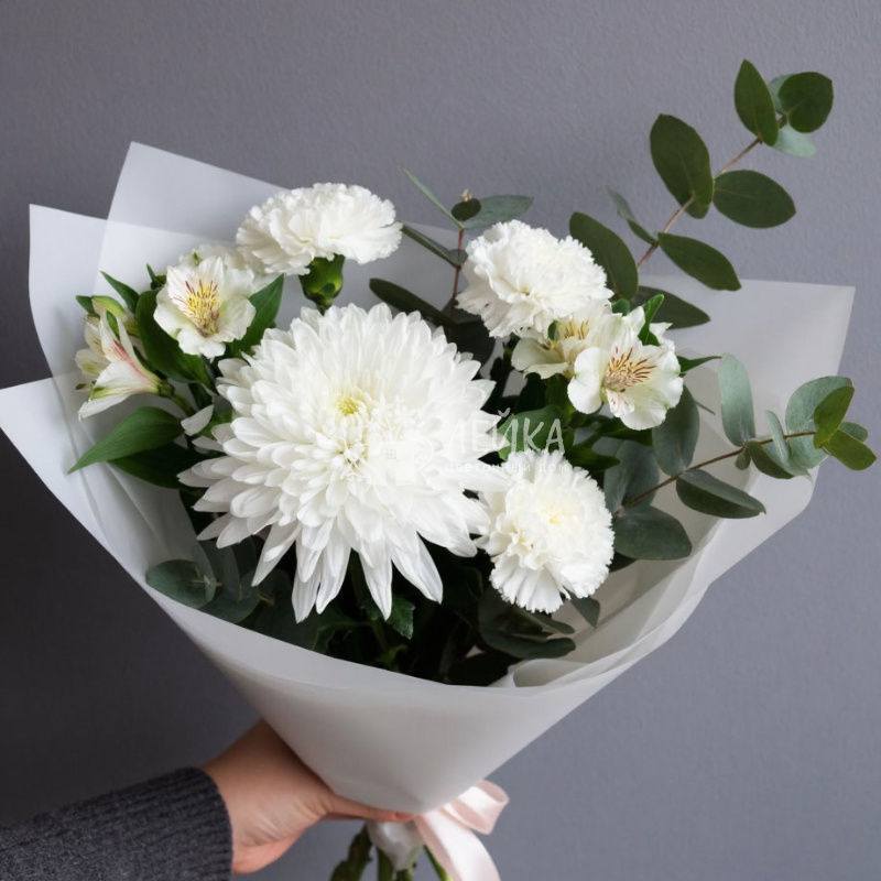 Букет из белых хризантем, альстромерий и гвоздик, дополненный изящными веточками эвкалипта, создает элегантную композицию. Белые цветы символизируют чистоту и нежность, а зелень добавляет свежесть и яркость, создавая гармоничный и стильный образ, идеально подходящий для любого торжественного случая. Букет собран из самых стойких цветов