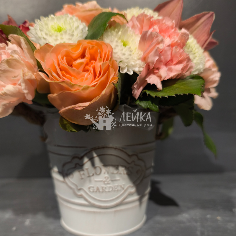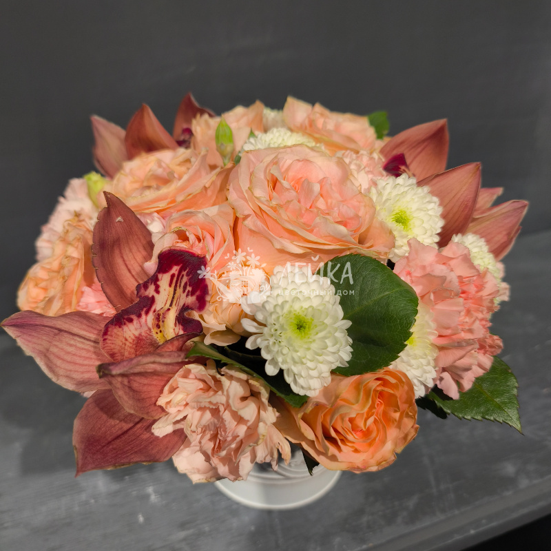 Букет представляет собой элегантную композицию из персиковых роз, белых хризантем и бордовых орхидей, создавая нежный и романтичный образ. Необычные оттенки и текстуры цветов придают ему изысканный и современный вид. Этот букет станет прекрасным подарком для особого случая или романтического сюрприза. Композиция в металлическом кашпо